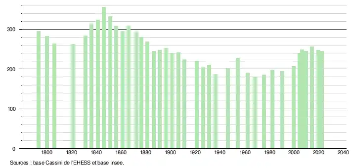 L'évolution du nombre d'habitants est connue à travers les recensements de la population effectués dans la commune depuis 1793. Pour les communes de moins de 10 000 habitants, une enquête de recensement portant sur toute la population est réalisée tous les cinq ans, les populations de référence des années intermédiaires étant quant à elles estimées par interpolation ou extrapolation[40]. Pour la commune, le premier recensement exhaustif entrant dans le cadre du nouveau dispositif a été réalisé en 2004[41].