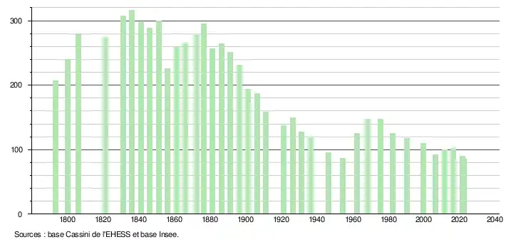 L'évolution du nombre d'habitants est connue à travers les recensements de la population effectués dans la commune depuis 1793. Pour les communes de moins de 10 000 habitants, une enquête de recensement portant sur toute la population est réalisée tous les cinq ans, les populations de référence des années intermédiaires étant quant à elles estimées par interpolation ou extrapolation[15]. Pour la commune, le premier recensement exhaustif entrant dans le cadre du nouveau dispositif a été réalisé en 2006[16].
