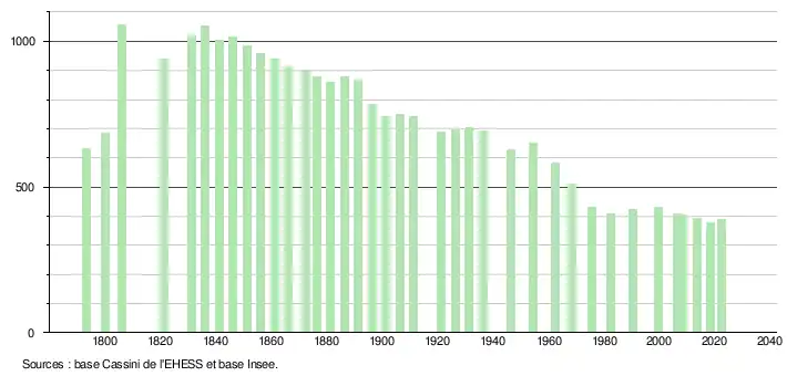 | L'évolution du nombre d'habitants est connue à travers les recensements de la population effectués dans la commune depuis 1793. Pour les communes de moins de 10 000 habitants, une enquête de recensement portant sur toute la population est réalisée tous les cinq ans, les populations de référence des années intermédiaires étant quant à elles estimées par interpolation ou extrapolation[32]. Pour la commune, le premier recensement exhaustif entrant dans le cadre du nouveau dispositif a été réalisé en 2008[33]. En 2022, la commune comptait 389 habitants[Note 7], en évolution de +0,78 % par rapport à 2016 (Tarn-et-Garonne : +3,12 %, France hors Mayotte : +2,11 %). |