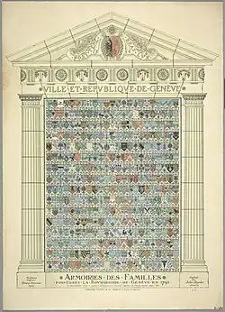 - Les bourgeois : fils de bourgeois ou de citoyens mais nés en pays étranger, ou étrangers qui avaient acquis le droit de bourgeoisie auprès du Magistrat[1],[2]. L'accession à la bourgeoisie devait normalement être achetée. Outre la somme d’argent, il était d'usage de payer un « seillot »[3] et souvent aussi une arme à feu. La bourgeoise de Genève était aussi accordée gratuitement ou à prix réduit pour services rendus[4],[5]. Les bourgeois pouvaient être du Conseil général et même du Conseil des Deux-Cents.