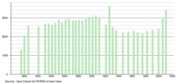 L'évolution du nombre d'habitants est connue à travers les recensements de la population effectués dans la commune depuis 1795. À partir du , les populations légales des communes sont publiées annuellement dans le cadre d'un recensement qui repose désormais sur une collecte d'information annuelle, concernant successivement tous les territoires communaux au cours d'une période de cinq ans. Pour les communes de moins de 10 000 habitants, une enquête de recensement portant sur toute la population est réalisée tous les cinq ans, les populations légales des années intermédiaires étant quant à elles estimées par interpolation ou extrapolation[9]. Pour la commune, le premier recensement exhaustif entrant dans le cadre du nouveau dispositif a été réalisé en 2005[10],[Note 1].