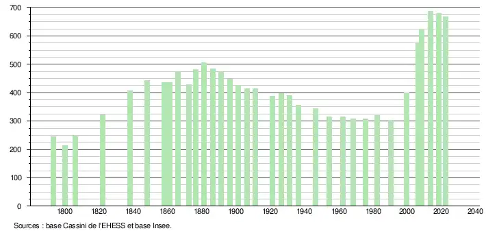L'évolution du nombre d'habitants est connue à travers les recensements de la population effectués dans la commune depuis 1793. Pour les communes de moins de 10 000 habitants, une enquête de recensement portant sur toute la population est réalisée tous les cinq ans, les populations de référence des années intermédiaires étant quant à elles estimées par interpolation ou extrapolation[14]. Pour la commune, le premier recensement exhaustif entrant dans le cadre du nouveau dispositif a été réalisé en 2008[15].