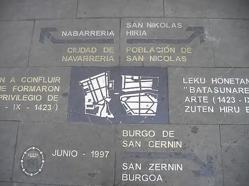Avec le temps l'union sera claire et la segmentation presque symbolique, seulement identifiable par les paroisses, sauf la double paroisse de la ville de San Cernin. Dans l'espace intermédiaire des trois on construira la mairie. Pour sa part, le puits de séparation entre San Nicolás et San Cernin sera rempli et sur lui construite l'actuelle calle Nueva vers 1585.