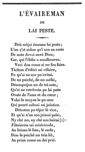 | Article premier de la Déclaration universelle des droits de l'homme[réf. nécessaire] (voir le texte en français) : Tôtes les jans nâssant libres et pairoils dans lote deignetai et dans los dreits. El aivant de lai raizon et peus de lai conscience et ai devant aigi les eins por les autres comant des freires. Extrait de roman en morvandiau : Lai maïon n'ost point frômée, ale ost ziâr ouvrie ès quaitre vents que chûlont brâmant ichi tôte l'an-née : Gailarne, Soulâr, Bige pis Drévent. |