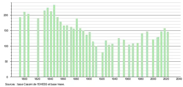 L'évolution du nombre d'habitants est connue à travers les recensements de la population effectués dans la commune depuis 1793. Pour les communes de moins de 10 000 habitants, une enquête de recensement portant sur toute la population est réalisée tous les cinq ans, les populations de référence des années intermédiaires étant quant à elles estimées par interpolation ou extrapolation[24]. Pour la commune, le premier recensement exhaustif entrant dans le cadre du nouveau dispositif a été réalisé en 2007[25].