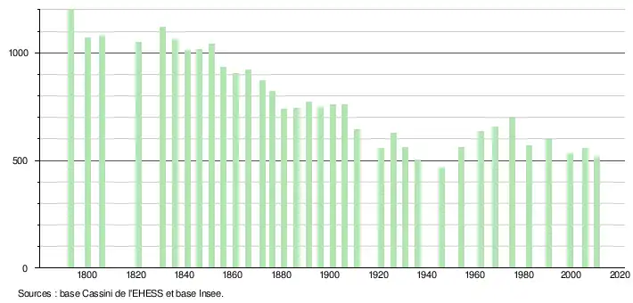 - ↑ Par convention dans Wikipédia, le principe a été retenu de n’afficher dans le tableau des recensements et le graphique, pour les populations légales postérieures à 1999, que les populations correspondant à une enquête exhaustive de recensement pour les communes de moins de 10 000 habitants, et que les populations des années 2006, 2011, 2016, etc. pour les communes de plus de 10 000 habitants, ainsi que la dernière population légale publiée par l’Insee pour l'ensemble des communes.
