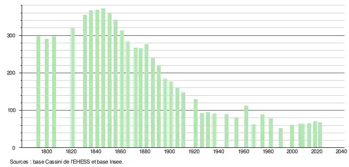 L'évolution du nombre d'habitants est connue à travers les recensements de la population effectués dans la commune depuis 1793. Pour les communes de moins de 10 000 habitants, une enquête de recensement portant sur toute la population est réalisée tous les cinq ans, les populations de référence des années intermédiaires étant quant à elles estimées par interpolation ou extrapolation[49]. Pour la commune, le premier recensement exhaustif entrant dans le cadre du nouveau dispositif a été réalisé en 2008[50].