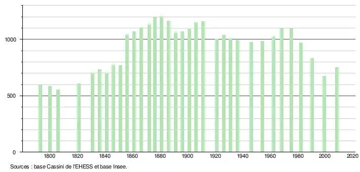 L'évolution du nombre d'habitants est connue à travers les recensements de la population effectués dans la commune depuis 1793. À partir du , les populations légales des communes sont publiées annuellement dans le cadre d'un recensement qui repose désormais sur une collecte d'information annuelle, concernant successivement tous les territoires communaux au cours d'une période de cinq ans. Pour les communes de moins de 10 000 habitants, une enquête de recensement portant sur toute la population est réalisée tous les cinq ans, les populations légales des années intermédiaires étant quant à elles estimées par interpolation ou extrapolation[6]. Pour la commune, le premier recensement exhaustif entrant dans le cadre du nouveau dispositif a été réalisé en 2008[7],[Note 1].