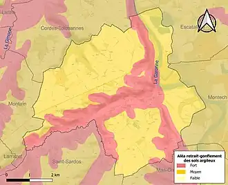 Le retrait-gonflement des sols argileux est susceptible d'engendrer des dommages importants aux bâtiments en cas d’alternance de périodes de sécheresse et de pluie. La totalité de la commune est en aléa moyen ou fort (92 % au niveau départemental et 48,5 % au niveau national). Sur les 380 bâtiments dénombrés sur la commune en 2019, 380 sont en aléa moyen ou fort, soit 100 %, à comparer aux 96 % au niveau départemental et 54 % au niveau national. Une cartographie de l'exposition du territoire national au retrait gonflement des sols argileux est disponible sur le site du BRGM[33],[Carte 3].