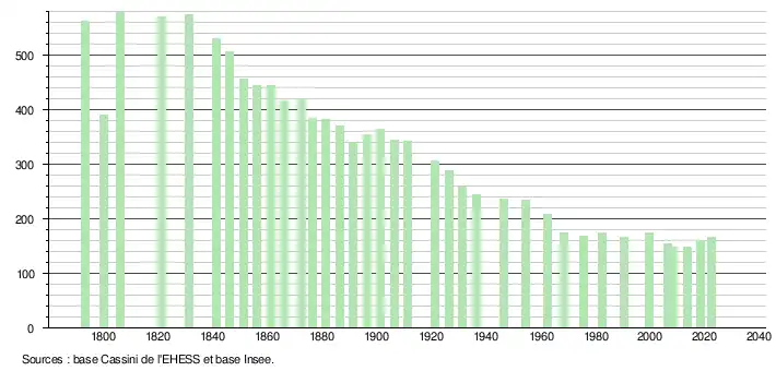 L'évolution du nombre d'habitants est connue à travers les recensements de la population effectués dans la commune depuis 1793. Pour les communes de moins de 10 000 habitants, une enquête de recensement portant sur toute la population est réalisée tous les cinq ans, les populations de référence des années intermédiaires étant quant à elles estimées par interpolation ou extrapolation[25]. Pour la commune, le premier recensement exhaustif entrant dans le cadre du nouveau dispositif a été réalisé en 2008[26].
