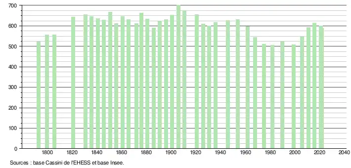 L'évolution du nombre d'habitants est connue à travers les recensements de la population effectués dans la commune depuis 1793. Pour les communes de moins de 10 000 habitants, une enquête de recensement portant sur toute la population est réalisée tous les cinq ans, les populations de référence des années intermédiaires étant quant à elles estimées par interpolation ou extrapolation[40]. Pour la commune, le premier recensement exhaustif entrant dans le cadre du nouveau dispositif a été réalisé en 2006[41].