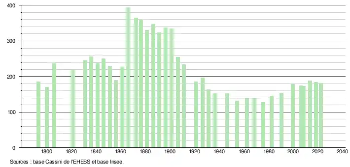 L'évolution du nombre d'habitants est connue à travers les recensements de la population effectués dans la commune depuis 1793. Pour les communes de moins de 10 000 habitants, une enquête de recensement portant sur toute la population est réalisée tous les cinq ans, les populations de référence des années intermédiaires étant quant à elles estimées par interpolation ou extrapolation[31]. Pour la commune, le premier recensement exhaustif entrant dans le cadre du nouveau dispositif a été réalisé en 2008[32].