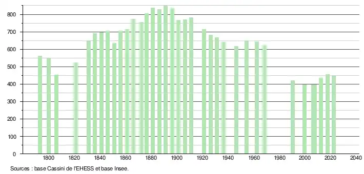 L'évolution du nombre d'habitants est connue à travers les recensements de la population effectués dans la commune depuis 1793. Pour les communes de moins de 10 000 habitants, une enquête de recensement portant sur toute la population est réalisée tous les cinq ans, les populations de référence des années intermédiaires étant quant à elles estimées par interpolation ou extrapolation[20]. Pour la commune, le premier recensement exhaustif entrant dans le cadre du nouveau dispositif a été réalisé en 2007[21].