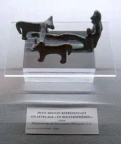 Le boustrophédon est une écriture dont le sens alterne d'une ligne à l'autre, à la manière du bœuf marquant les sillons dans un champ, allant de droite à gauche puis de gauche à droite. Le terme vient de l'adverbe grec ancien βουστροφηδόν boustrophêdón, de βοῦς boũs « bœuf » et στροφή strophế « action de tourner », allusion au trajet du bœuf lors du labour. Souvent, le ductus des lettres s'inverse avec le changement de direction ; par exemple, la lettre Є tracée de gauche à droite deviendra Э de droite à gauche.