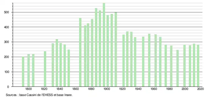 L'évolution du nombre d'habitants est connue à travers les recensements de la population effectués dans la commune depuis 1793. Pour les communes de moins de 10 000 habitants, une enquête de recensement portant sur toute la population est réalisée tous les cinq ans, les populations de référence des années intermédiaires étant quant à elles estimées par interpolation ou extrapolation[4]. Pour la commune, le premier recensement exhaustif entrant dans le cadre du nouveau dispositif a été réalisé en 2006[5].