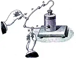 « Dans ce but, j'avais suspendu à deux fils de soie bleue (toujours de la soie bleue) un canon de fer, qui par communication recevait l'électricité d'un globe de verre qu'on faisait tourner rapidement sur son axe, pendant qu'on le frottait en y appliquant les mains. À l'autre extrémité pendait librement un fil de laiton dont le bout était plongé dans un vase de verre rond, en partie plein d'eau, que je tenais dans ma mains droite ; avec l'autre main, j'essayais de tirer des étincelles du canon de fer électrisé. Tout à coup ma main droite fut frappée avec tant de violence, que j'eus tout le corps ébranlé comme d'un coup de foudre. »