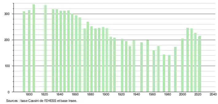 L'évolution du nombre d'habitants est connue à travers les recensements de la population effectués dans la commune depuis 1793. Pour les communes de moins de 10 000 habitants, une enquête de recensement portant sur toute la population est réalisée tous les cinq ans, les populations de référence des années intermédiaires étant quant à elles estimées par interpolation ou extrapolation[22]. Pour la commune, le premier recensement exhaustif entrant dans le cadre du nouveau dispositif a été réalisé en 2006[23].