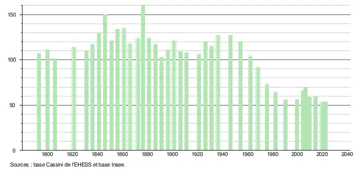 L'évolution du nombre d'habitants est connue à travers les recensements de la population effectués dans la commune depuis 1793. Pour les communes de moins de 10 000 habitants, une enquête de recensement portant sur toute la population est réalisée tous les cinq ans, les populations de référence des années intermédiaires étant quant à elles estimées par interpolation ou extrapolation[18]. Pour la commune, le premier recensement exhaustif entrant dans le cadre du nouveau dispositif a été réalisé en 2004[19].