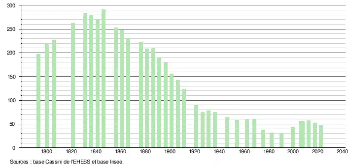 L'évolution du nombre d'habitants est connue à travers les recensements de la population effectués dans la commune depuis 1793. Pour les communes de moins de 10 000 habitants, une enquête de recensement portant sur toute la population est réalisée tous les cinq ans, les populations de référence des années intermédiaires étant quant à elles estimées par interpolation ou extrapolation[28]. Pour la commune, le premier recensement exhaustif entrant dans le cadre du nouveau dispositif a été réalisé en 2007[29].