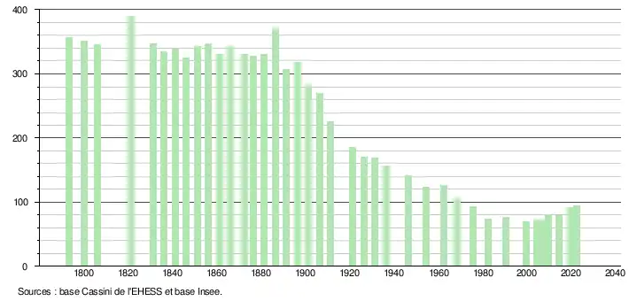 L'évolution du nombre d'habitants est connue à travers les recensements de la population effectués dans la commune depuis 1793. Pour les communes de moins de 10 000 habitants, une enquête de recensement portant sur toute la population est réalisée tous les cinq ans, les populations de référence des années intermédiaires étant quant à elles estimées par interpolation ou extrapolation[46]. Pour la commune, le premier recensement exhaustif entrant dans le cadre du nouveau dispositif a été réalisé en 2004[47].
