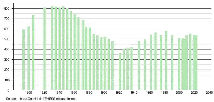 L'évolution du nombre d'habitants est connue à travers les recensements de la population effectués dans la commune depuis 1793. Pour les communes de moins de 10 000 habitants, une enquête de recensement portant sur toute la population est réalisée tous les cinq ans, les populations de référence des années intermédiaires étant quant à elles estimées par interpolation ou extrapolation[22]. Pour la commune, le premier recensement exhaustif entrant dans le cadre du nouveau dispositif a été réalisé en 2004[23].