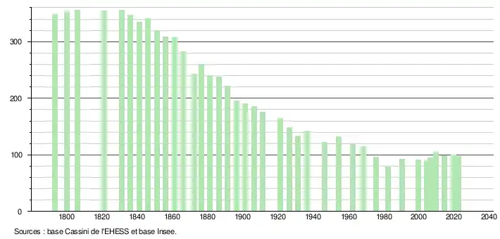 L'évolution du nombre d'habitants est connue à travers les recensements de la population effectués dans la commune depuis 1793. Pour les communes de moins de 10000habitants, une enquête de recensement portant sur toute la population est réalisée tous les cinqans, les populations de référence des années intermédiaires étant quant à elles estimées par interpolation ou extrapolation[23]. Pour la commune, le premier recensement exhaustif entrant dans le cadre du nouveau dispositif a été réalisé en 2004[24].