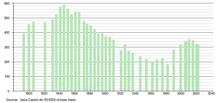 L'évolution du nombre d'habitants est connue à travers les recensements de la population effectués dans la commune depuis 1793. Pour les communes de moins de 10 000 habitants, une enquête de recensement portant sur toute la population est réalisée tous les cinq ans, les populations de référence des années intermédiaires étant quant à elles estimées par interpolation ou extrapolation[24]. Pour la commune, le premier recensement exhaustif entrant dans le cadre du nouveau dispositif a été réalisé en 2005[25].