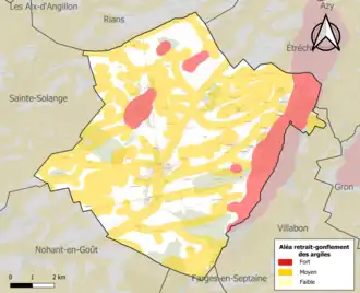 La commune est vulnérable au risque de mouvements de terrains constitué principalement du retrait-gonflement des sols argileux[16]. Cet aléa est susceptible d'engendrer des dommages importants aux bâtiments en cas d’alternance de périodes de sécheresse et de pluie. 65,6 % de la superficie communale est en aléa moyen ou fort (90 % au niveau départemental et 48,5 % au niveau national). Sur les 425 bâtiments dénombrés sur la commune en 2019, 227 sont en aléa moyen ou fort, soit 53 %, à comparer aux 83 % au niveau départemental et 54 % au niveau national. Une cartographie de l'exposition du territoire national au retrait gonflement des sols argileux est disponible sur le site du BRGM[17],[Carte 2].