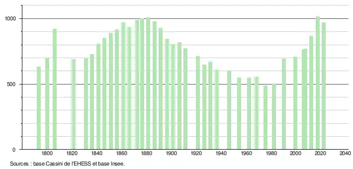 L'évolution du nombre d'habitants est connue à travers les recensements de la population effectués dans la commune depuis 1793. Pour les communes de moins de 10 000 habitants, une enquête de recensement portant sur toute la population est réalisée tous les cinq ans, les populations de référence des années intermédiaires étant quant à elles estimées par interpolation ou extrapolation[28]. Pour la commune, le premier recensement exhaustif entrant dans le cadre du nouveau dispositif a été réalisé en 2007[29].