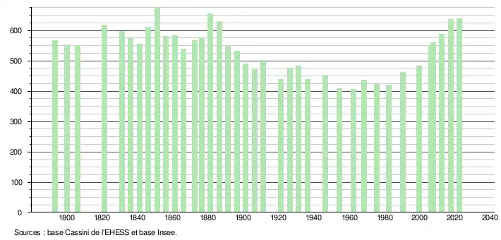 L'évolution du nombre d'habitants est connue à travers les recensements de la population effectués dans la commune depuis 1793. Pour les communes de moins de 10 000 habitants, une enquête de recensement portant sur toute la population est réalisée tous les cinq ans, les populations de référence des années intermédiaires étant quant à elles estimées par interpolation ou extrapolation[21]. Pour la commune, le premier recensement exhaustif entrant dans le cadre du nouveau dispositif a été réalisé en 2007[22].