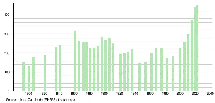 L'évolution du nombre d'habitants est connue à travers les recensements de la population effectués dans la commune depuis 1793. Pour les communes de moins de 10 000 habitants, une enquête de recensement portant sur toute la population est réalisée tous les cinq ans, les populations de référence des années intermédiaires étant quant à elles estimées par interpolation ou extrapolation[22]. Pour la commune, le premier recensement exhaustif entrant dans le cadre du nouveau dispositif a été réalisé en 2005[23].