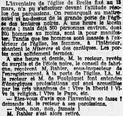 L'inventaire des biens d'église à Brélès ne put se faire comme prévu le en raison des manifestations des paroissiens, mais put finalement se faire sans trop de difficultés en novembre 1906 car trois agents surprirent le sacristain et lui dérobèrent de force la clef de l'église[31].