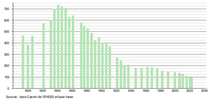 L'évolution du nombre d'habitants est connue à travers les recensements de la population effectués dans la commune depuis 1793. Pour les communes de moins de 10 000 habitants, une enquête de recensement portant sur toute la population est réalisée tous les cinq ans, les populations de référence des années intermédiaires étant quant à elles estimées par interpolation ou extrapolation[18]. Pour la commune, le premier recensement exhaustif entrant dans le cadre du nouveau dispositif a été réalisé en 2005[19].