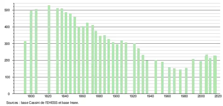 L'évolution du nombre d'habitants est connue à travers les recensements de la population effectués dans la commune depuis 1793. Pour les communes de moins de 10 000 habitants, une enquête de recensement portant sur toute la population est réalisée tous les cinq ans, les populations de référence des années intermédiaires étant quant à elles estimées par interpolation ou extrapolation[3]. Pour la commune, le premier recensement exhaustif entrant dans le cadre du nouveau dispositif a été réalisé en 2005[4].