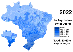 Dans l'estimation de la population de 2017, la population qui s'est déclarée blanche était de 90,38 millions (43,6 %), tandis que celle qui s'est déclarée métisse était de 96,9 millions (46,8 %). La même estimation a également montré que dans les régions du Sud et du Sud-Est, la population blanche prédominait (75,6 % et 51,2 %, respectivement). Les États de Santa Catarina, Rio Grande do Sul, Paraná et São Paulo sont les seuls États du pays où la population blanche est majoritaire dans toutes les régions, dépassant les 50 %. On trouve également des Blancs avec un pourcentage supérieur à 50 % dans certaines régions de Rio de Janeiro, du Mato Grosso do Sul, du Minas Gerais, de l'Espírito Santo, du Goiás, du Mato Grosso et du Rio Grande do Norte[4].