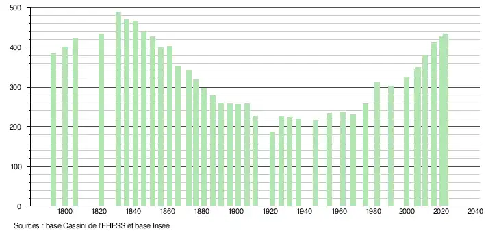 L'évolution du nombre d'habitants est connue à travers les recensements de la population effectués dans la commune depuis 1793. Pour les communes de moins de 10 000 habitants, une enquête de recensement portant sur toute la population est réalisée tous les cinq ans, les populations de référence des années intermédiaires étant quant à elles estimées par interpolation ou extrapolation[25]. Pour la commune, le premier recensement exhaustif entrant dans le cadre du nouveau dispositif a été réalisé en 2005[26].