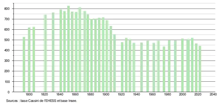 L'évolution du nombre d'habitants est connue à travers les recensements de la population effectués dans la commune depuis 1793. Pour les communes de moins de 10 000 habitants, une enquête de recensement portant sur toute la population est réalisée tous les cinq ans, les populations de référence des années intermédiaires étant quant à elles estimées par interpolation ou extrapolation[29]. Pour la commune, le premier recensement exhaustif entrant dans le cadre du nouveau dispositif a été réalisé en 2007[30].