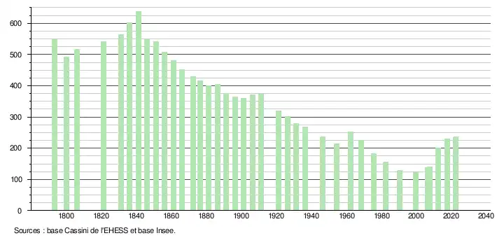 L'évolution du nombre d'habitants est connue à travers les recensements de la population effectués dans la commune depuis 1793. Pour les communes de moins de 10 000 habitants, une enquête de recensement portant sur toute la population est réalisée tous les cinq ans, les populations de référence des années intermédiaires étant quant à elles estimées par interpolation ou extrapolation[19]. Pour la commune, le premier recensement exhaustif entrant dans le cadre du nouveau dispositif a été réalisé en 2007[20].