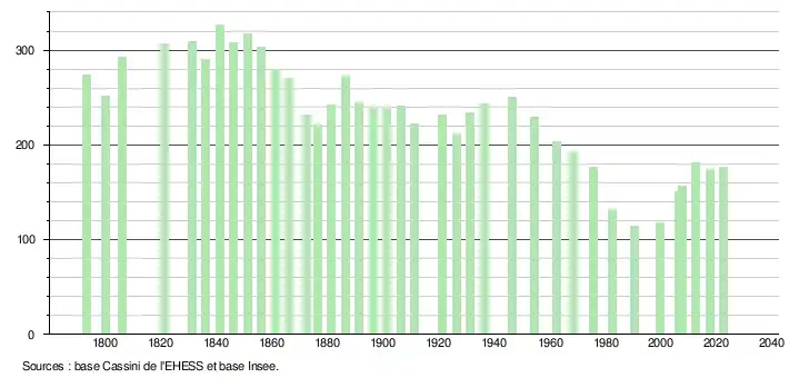 L'évolution du nombre d'habitants est connue à travers les recensements de la population effectués dans la commune depuis 1793. Pour les communes de moins de 10 000 habitants, une enquête de recensement portant sur toute la population est réalisée tous les cinq ans, les populations de référence des années intermédiaires étant quant à elles estimées par interpolation ou extrapolation[23]. Pour la commune, le premier recensement exhaustif entrant dans le cadre du nouveau dispositif a été réalisé en 2007[24].