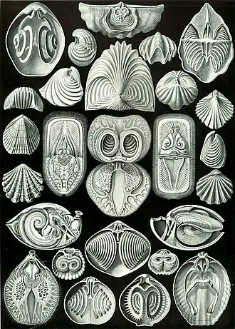 Les brachiopodes sont des animaux extrêmement anciens, appartenant comme les mollusques au groupe des protostomiens. De même que les mollusques bivalves (moule, huître, etc.), la coquille est composée de deux valves. Cependant, l'orientation des valves par rapport au corps est différente, car le plan de symétrie de l'animal est perpendiculaire au plan de séparation de ces dernières. Les brachiopodes ont une valve ventrale (ou pédonculaire, la plus grande) et une valve dorsale (ou brachiale, la plus petite), tandis que les mollusques bivalves ont une valve droite et une valve gauche.