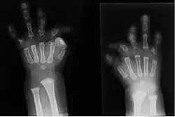 La brachydactylie est un terme de médecine signifiant : brièveté d'un ou de plusieurs doigts. C'est une caractéristique dont la transmission génétique est généralement autosomique dominante[1],[2]. Il existe cinq types de brachydactylie de A à E et cinq sous types de A1 à A5.