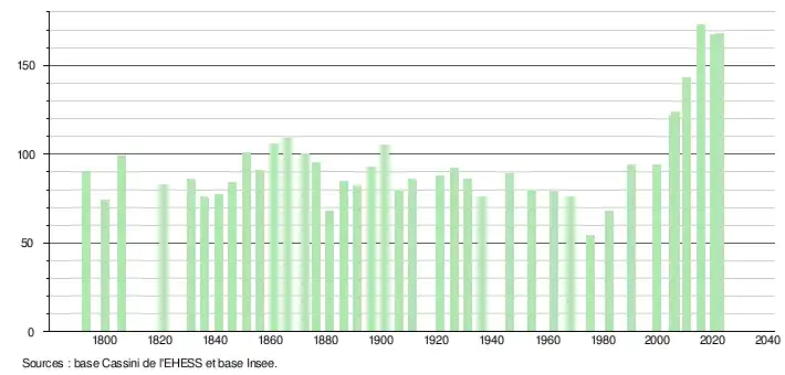 L'évolution du nombre d'habitants est connue à travers les recensements de la population effectués dans la commune depuis 1793. Pour les communes de moins de 10 000 habitants, une enquête de recensement portant sur toute la population est réalisée tous les cinq ans, les populations de référence des années intermédiaires étant quant à elles estimées par interpolation ou extrapolation[18]. Pour la commune, le premier recensement exhaustif entrant dans le cadre du nouveau dispositif a été réalisé en 2005[19].