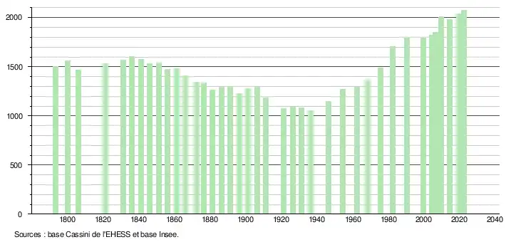 L'évolution du nombre d'habitants est connue à travers les recensements de la population effectués dans la commune depuis 1793. Pour les communes de moins de 10 000 habitants, une enquête de recensement portant sur toute la population est réalisée tous les cinq ans, les populations de référence des années intermédiaires étant quant à elles estimées par interpolation ou extrapolation[21]. Pour la commune, le premier recensement exhaustif entrant dans le cadre du nouveau dispositif a été réalisé en 2004[22].