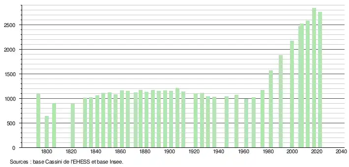 L'évolution du nombre d'habitants est connue à travers les recensements de la population effectués dans la commune depuis 1793. Pour les communes de moins de 10 000 habitants, une enquête de recensement portant sur toute la population est réalisée tous les cinq ans, les populations de référence des années intermédiaires étant quant à elles estimées par interpolation ou extrapolation[23]. Pour la commune, le premier recensement exhaustif entrant dans le cadre du nouveau dispositif a été réalisé en 2007[24].