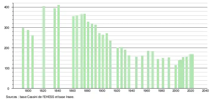 L'évolution du nombre d'habitants est connue à travers les recensements de la population effectués dans la commune depuis 1793. Pour les communes de moins de 10 000 habitants, une enquête de recensement portant sur toute la population est réalisée tous les cinq ans, les populations de référence des années intermédiaires étant quant à elles estimées par interpolation ou extrapolation[19]. Pour la commune, le premier recensement exhaustif entrant dans le cadre du nouveau dispositif a été réalisé en 2004[20].