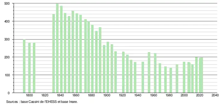 L'évolution du nombre d'habitants est connue à travers les recensements de la population effectués dans la commune depuis 1793. Pour les communes de moins de 10 000 habitants, une enquête de recensement portant sur toute la population est réalisée tous les cinq ans, les populations de référence des années intermédiaires étant quant à elles estimées par interpolation ou extrapolation[18]. Pour la commune, le premier recensement exhaustif entrant dans le cadre du nouveau dispositif a été réalisé en 2005[19].