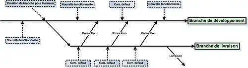 Par exemple, le logiciel « Toto » a subi plusieurs évolutions depuis sa première version. À partir de la version 2.1, ses concepteurs décident de publier une version et de continuer à ajouter des fonctionnalités jusqu'à atteindre la version 3.0, qui changera fondamentalement le logiciel. Peu de temps après que cette dernière version est sortie, ils sont amenés à devoir corriger des bugs dans la version 2.1 ; il est alors nécessaire de créer une nouvelle branche.
