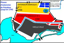 En 1713, le roi décidait de faire de Potsdam la résidence permanente de sa garde[4]. Il fallait donc agrandir la ville et repousser les murailles car il faut également penser à loger tous les corps de métier qui gravitent nécessairement autour des troupes militaires sur le plan pratique et technique[4]. La première extension de la ville se fait au nord de la vieille ville en 1722. L’actuel site de la Brandenburger Straße reste toujours un terrain marécageux. Le roi de Prusse appréciait surtout la mode néerlandaise, mais aussi les tendances architecturales baroques. La première phase est de ce fait appelée « première extension baroque ». Le centre-ville s’étendit de l’autre du canal et le mur d’enceinte longeait l’actuelle Charlottenstraße. Les nouvelles maisons résidentielles bâties dans ce secteur disposaient d’une pièce de 25 m2 pour les quartiers des soldats.