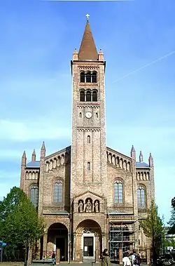 L'église catholique Saint-Pierre-et-Paul, bien que située officiellement am Bassin, clôt la rue de Brandebourg au moins visuellement. Elle sert de point de repère à l'est en face de la porte de Brandebourg. Les travaux furent terminés en 1870. Il fallait, en effet, une église pour la petite paroisse catholique rattachée à l'évêché de Berlin et surtout pour les soldats d'obédience catholique de plus en plus nombreux. Depuis 1992, elle est devenue église de prieuré. Cette église[28], qui a la forme d'une croix grecque, succède à un premier édifice baroque sans clocher, construit à la demande de Frédéric-Guillaume Ier en 1738 sur le terrain de la manufacture royale d'armes à feu. Devenue trop petite et endommagée, les architectes August Stüler, puis Wilhelm Salzenberg, construisent une église finalement éclectique puisque le clocher rappelle le campanile italien de San Zeno à Vérone, le chœur s'inspire de la Hagia Sophia avec trois absides conchyliformes, certaines parties intérieures sont baroques. Il fallut assécher et consolider le sous-sol marécageux avant d'ériger la nouvelle église. Une autre consécration eut lieu en 1950 à l'occasion de la restauration de l'édifice après les dégâts[29] causés par les bombardements de 1945. D'autres plans de travaux d'entretien ont été décidés en 2002 et 2006. L'église eys haute de 65 m et large de 38 m.
