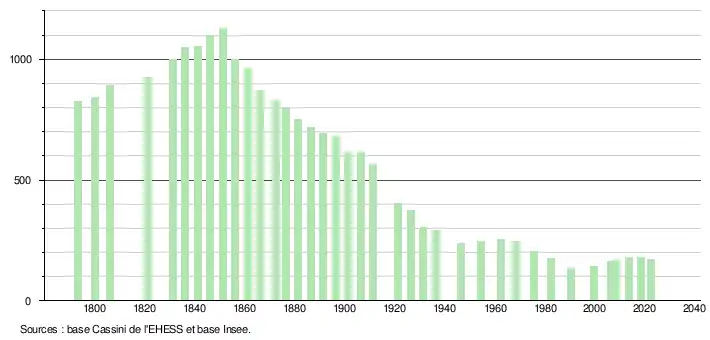 L'évolution du nombre d'habitants est connue à travers les recensements de la population effectués dans la commune depuis 1793. Pour les communes de moins de 10 000 habitants, une enquête de recensement portant sur toute la population est réalisée tous les cinq ans, les populations de référence des années intermédiaires étant quant à elles estimées par interpolation ou extrapolation[19]. Pour la commune, le premier recensement exhaustif entrant dans le cadre du nouveau dispositif a été réalisé en 2008[20].